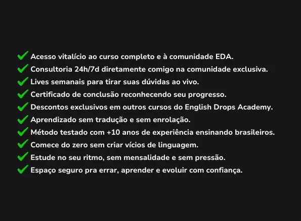 • Comunidade exclusiva do English Drops Academy – um espaço seguro para praticar, tirar dúvidas e interagir comigo e com outros alunos.